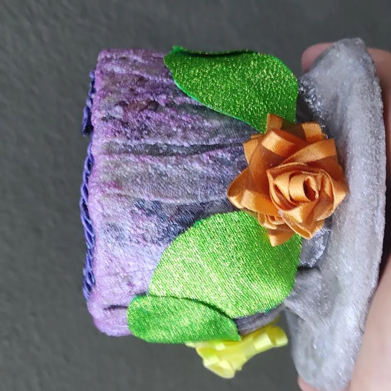 Composição: vidro, retalho de tecido, isopor reutilizável + solvente PU formando a resina, corante pó ( sombra de olhos), cimento cola + cimento branco + isopor ralado formando a base, retalhos de fitas de sétimo formando as flores e folhas, parafina + óleo reutilizado purificado + essência de citronela.