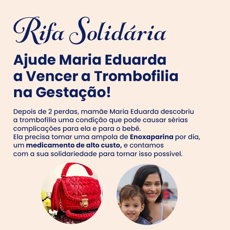 Depois de 2 perdas, mamãe Maria Eduarda descobriu a trombofilia uma condição que pode causar sérias complicações para ela e para o bebê. Ela precisa tomar uma ampola de Enoxaparina por dia, um medicamento de alto custo, e contamos com a sua solidariedade para tornar isso possível. Premiação uma bolsa de crochê