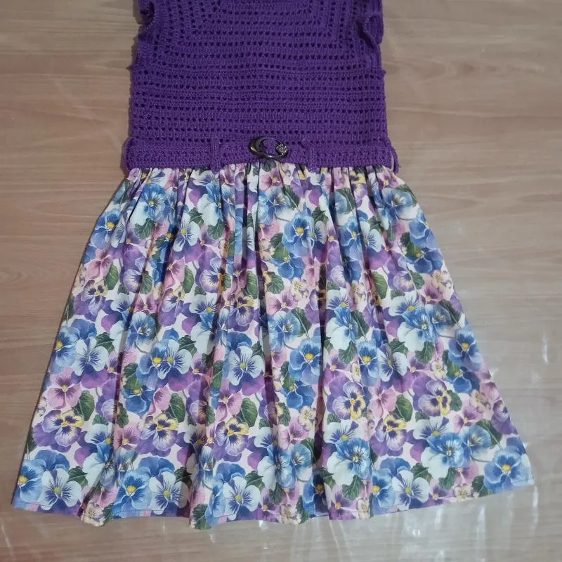Vestido infantil ( 7 anos), corpo crochê e saia tecido, cor lilás